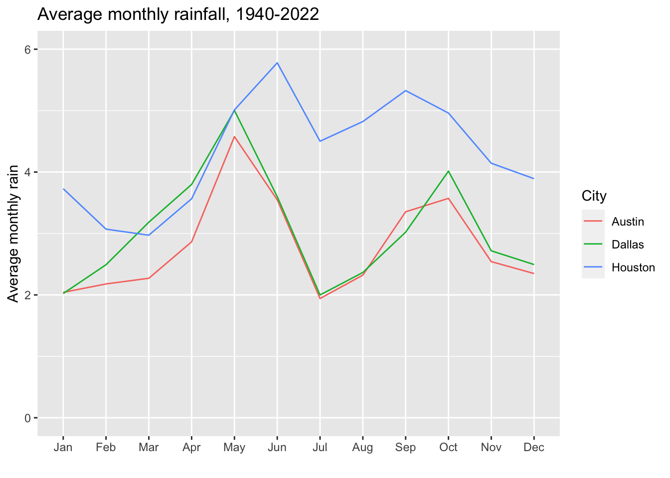 Here is a question that takes a couple of steps to accomplish: What is the average monthly rainfall for each city? i.e., How much rain should we expect each month, based on history?