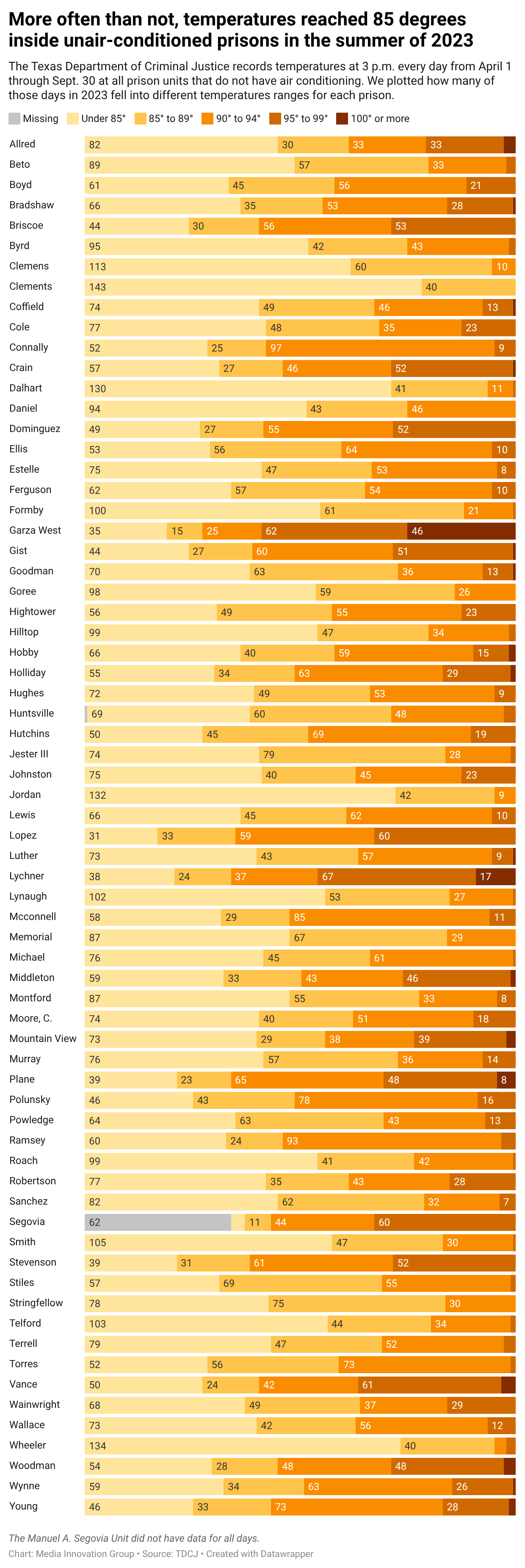 We wanted to show how many days it reached different temperature breaks, so we counted the days within each range. In this example from 2023, there is a bar for each prison unit, which the colors representing the number of days within each temperature range.