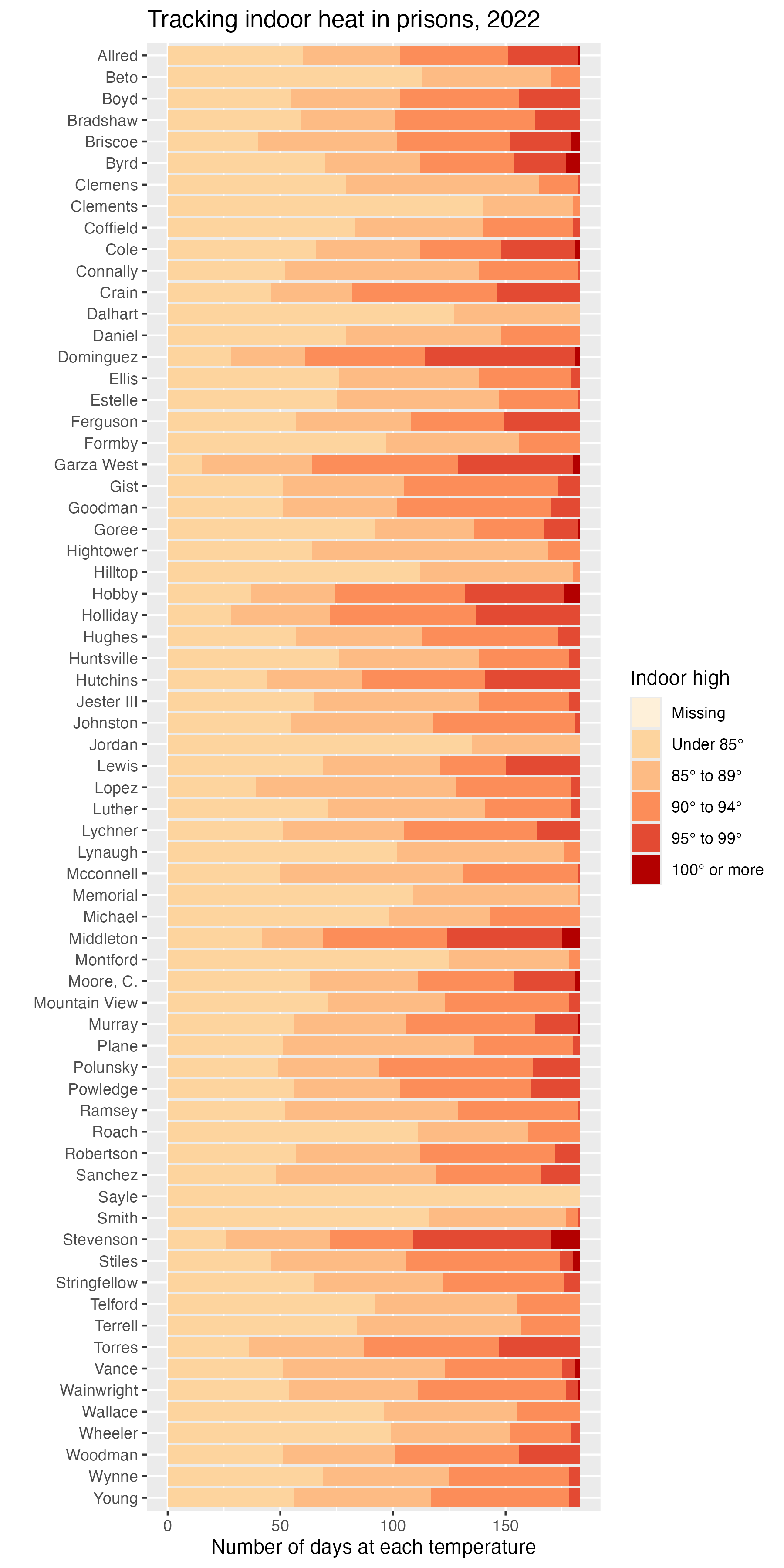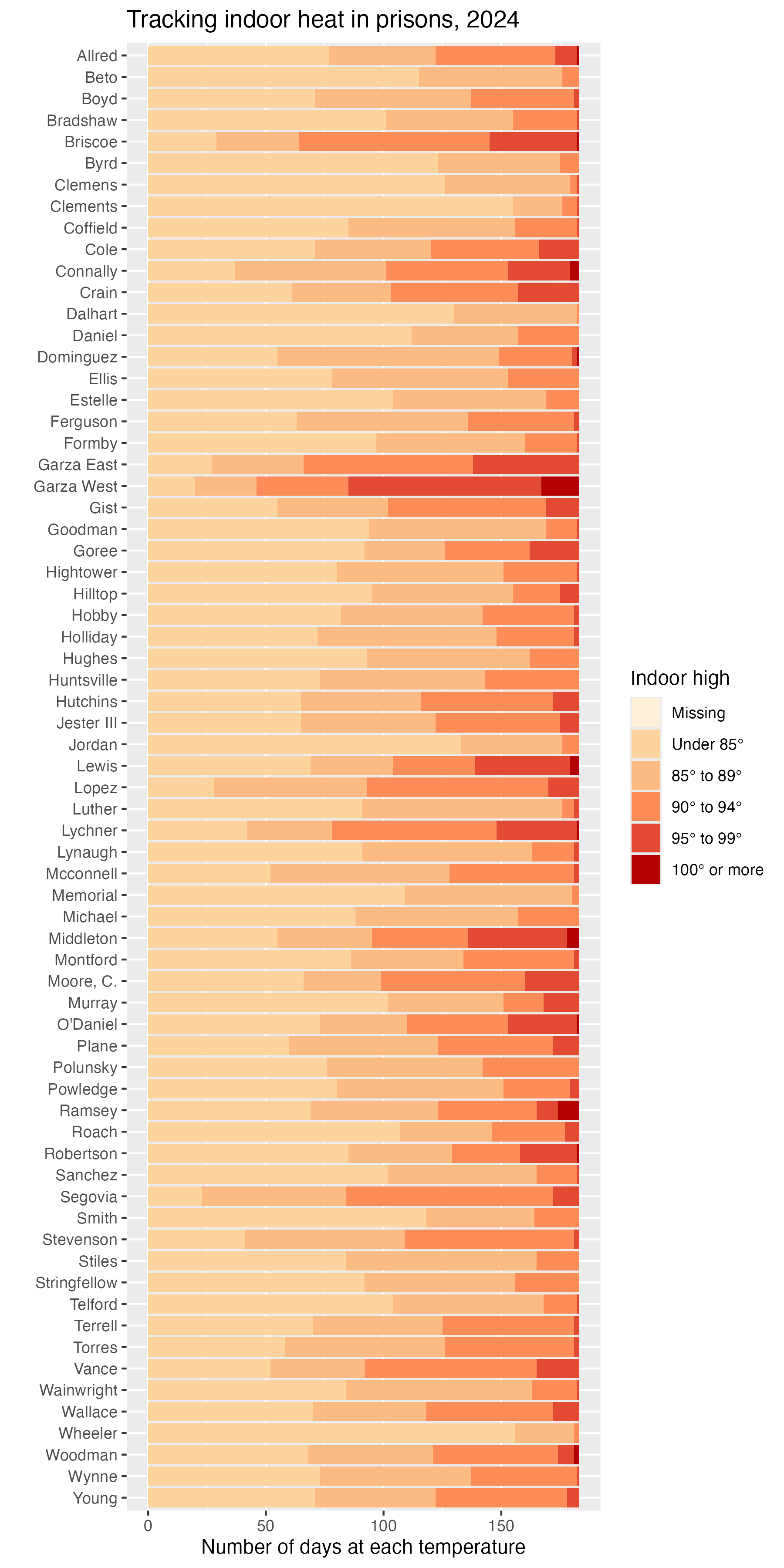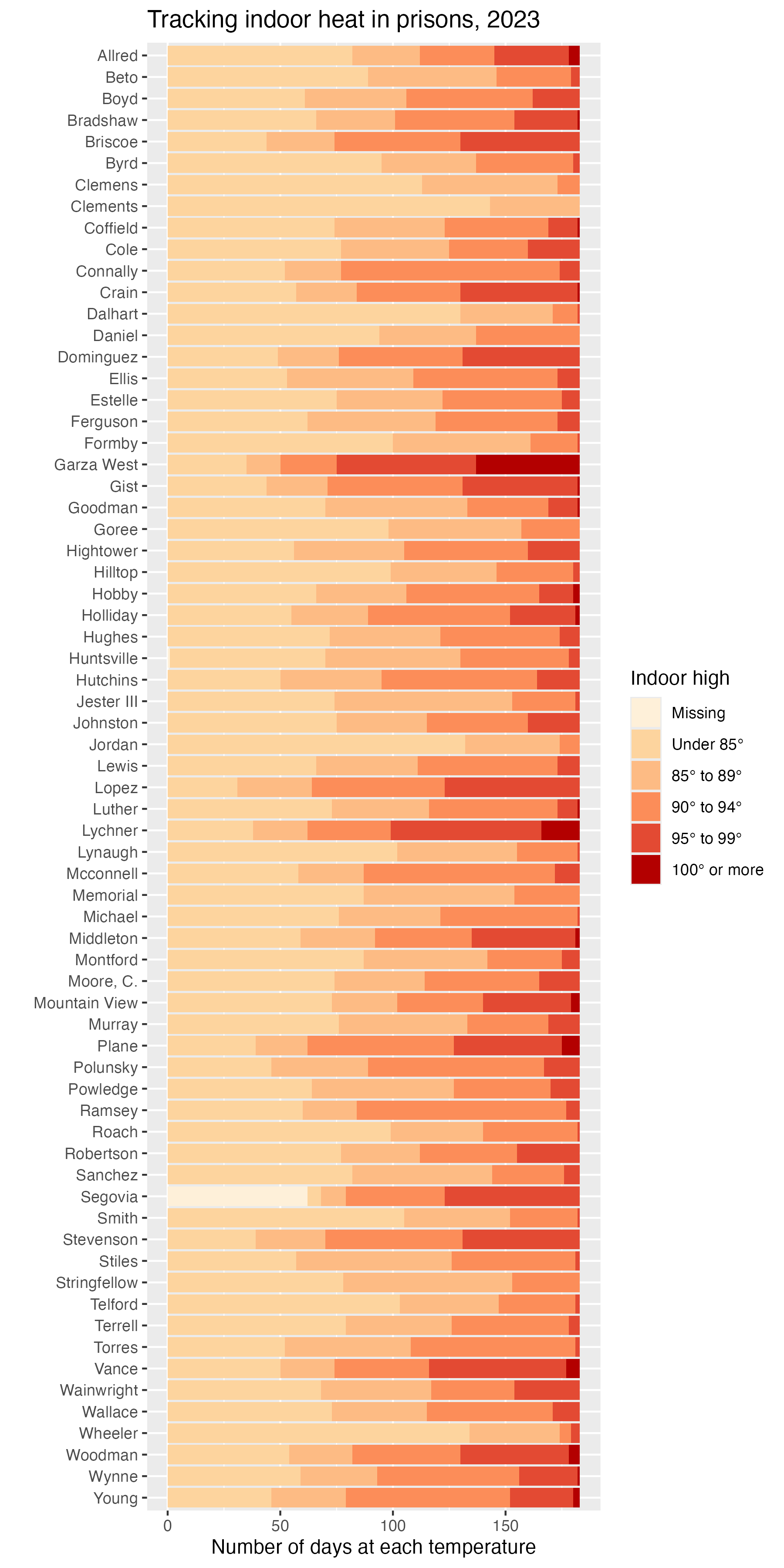 thresh_pot_2023_print <- thresh_data |>filter(year ==2023) |>ggplot(aes(x = days, y =fct_rev(unit), fill = threshold)) +geom_bar(stat ="identity", position =position_stack(reverse =TRUE)) +scale_fill_brewer(palette='OrRd',labels =c(cnt_na ="Missing",cnt_n85 ="Under 85°",cnt_85 ="85° to 89°",cnt_90 ="90° to 94°",cnt_95 ="95° to 99°",cnt_100 ="100° or more" )) +# theme(legend.position = "bottom") +labs(title =str_wrap("More often than not, temperatures reached 85 degrees inside unair-conditioned prisons in the summer of 2023", width =55),subtitle =str_wrap("The Texas Department of Criminal Justice records temperatures at 3 p.m. every day from April 1 through Sept. 30 at all prison units that do not have air conditioning. We plotted how many of those days in 2023 fell into different temperatures ranges for each prison.", width =68),x ="Number of days at each temperature", y ="",fill ="Indoor hightemperature",caption ="The Manuel A. Segovia Unit did not have data for all days.By: Media Innovation Group; Source: TDCJ" )ggsave("figures/thresh_pot_2023_print.png", width =6, height =12)