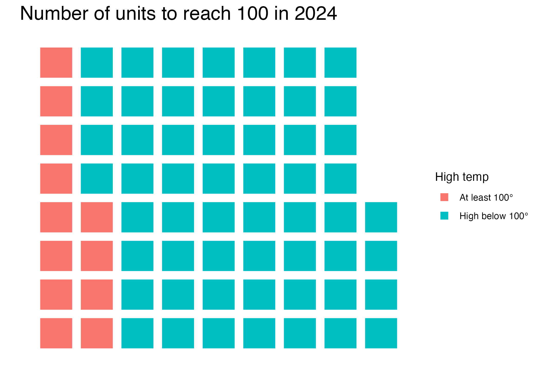 prison_waffle <-function(.data, yr) { .data |>select(unit, year, cnt_100) |>mutate(r_100 =if_else(cnt_100 >0, "At least 100°", "High below 100°")) |>filter(year == yr) |>waffle_iron(aes_d(group = r_100)) |>ggplot(aes(x, y, fill = group)) +geom_waffle() +theme_waffle() +labs(title =paste("Number of units to reach 100 in", yr),x ="", y ="", fill ="High temp" )ggsave(paste0("figures/waffle_plot_", yr, ".png"))}count_temps_unit_year |>prison_waffle(2022)count_temps_unit_year |>prison_waffle(2023)count_temps_unit_year |>prison_waffle(2024)count_temps_unit_year |>prison_waffle(2025)