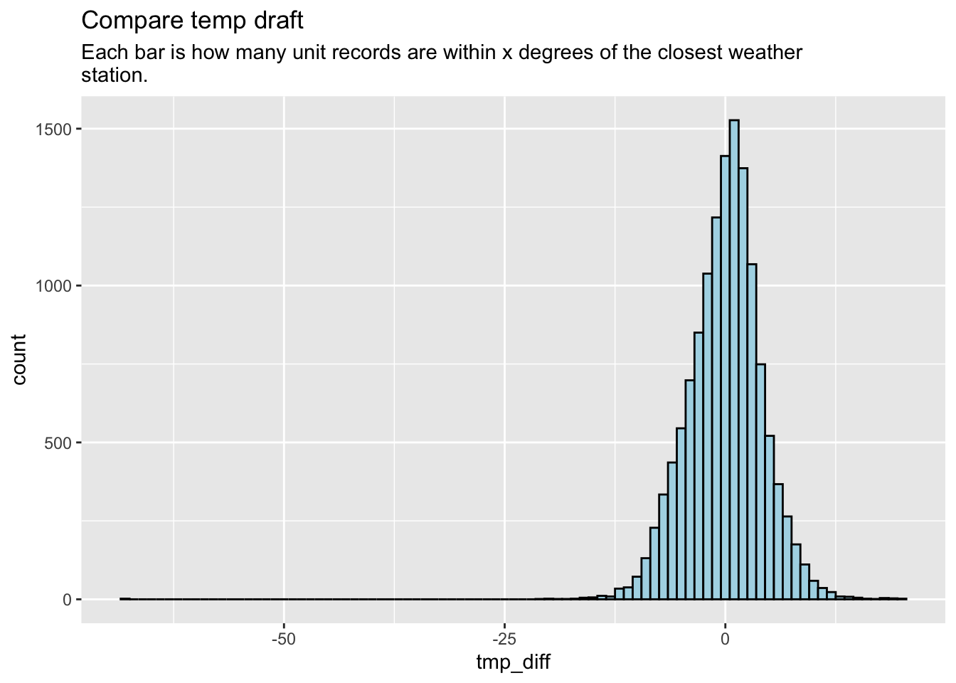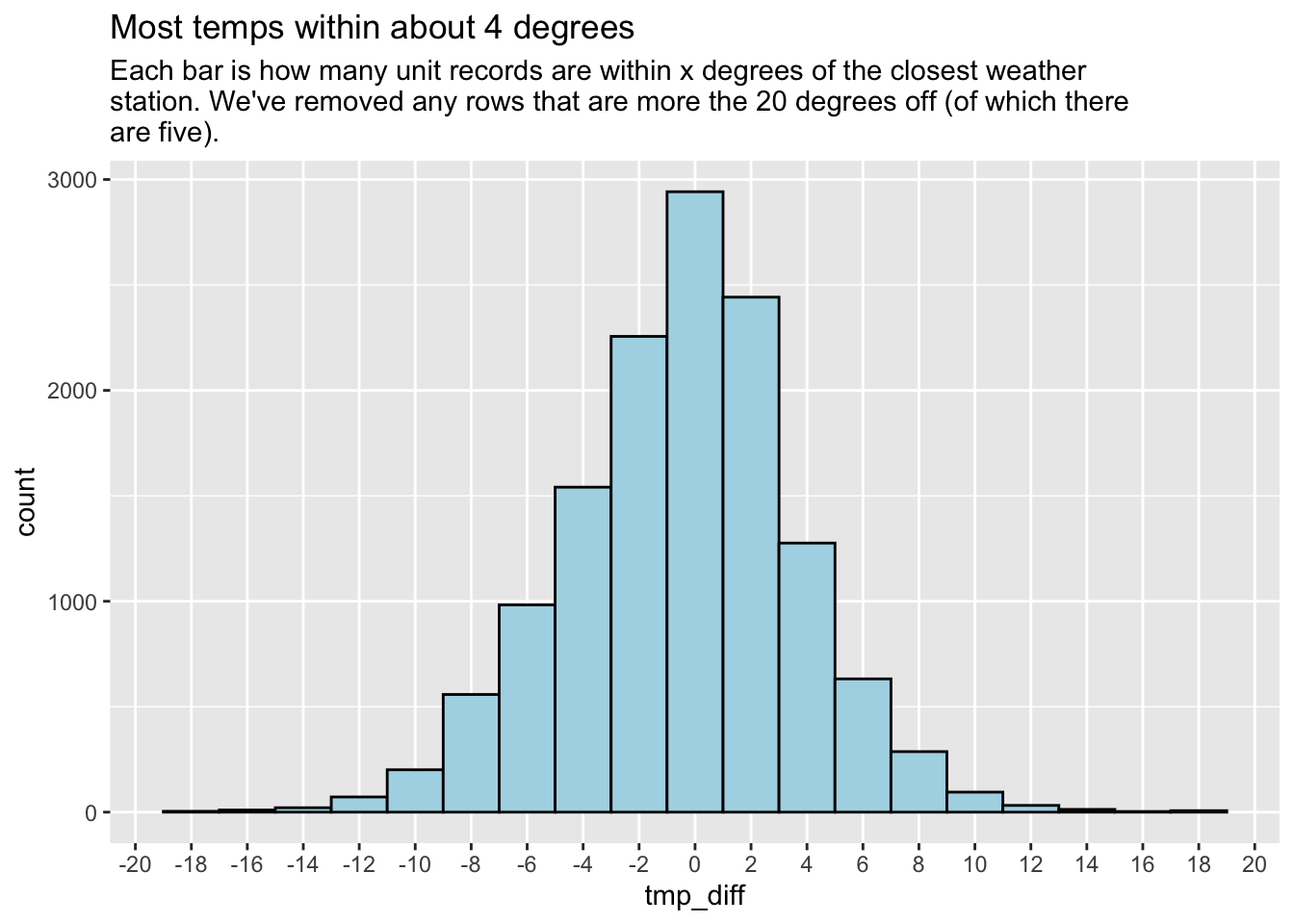 subtitle = str_wrap("Each bar is how many unit records are within x degrees of the closest weather station. We've removed any rows that are more the 20 degrees off (of which there are five).")
